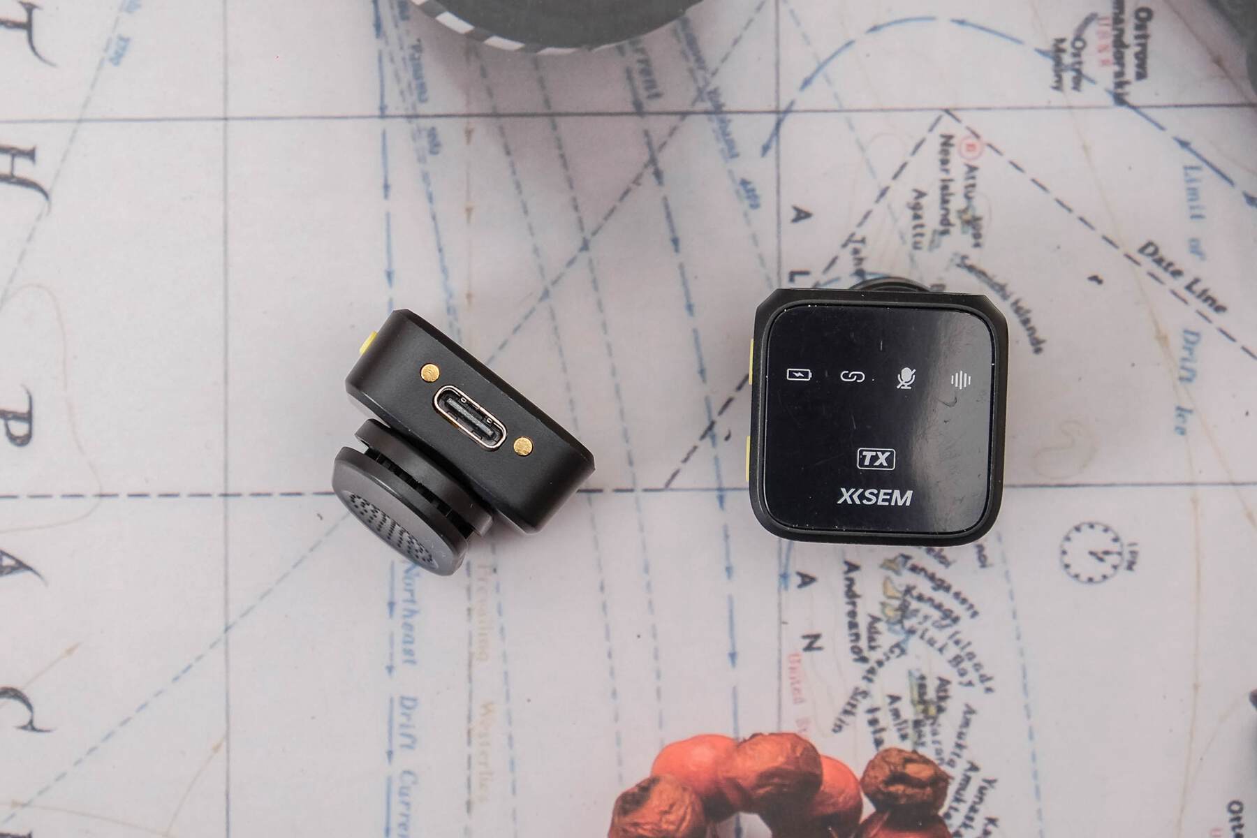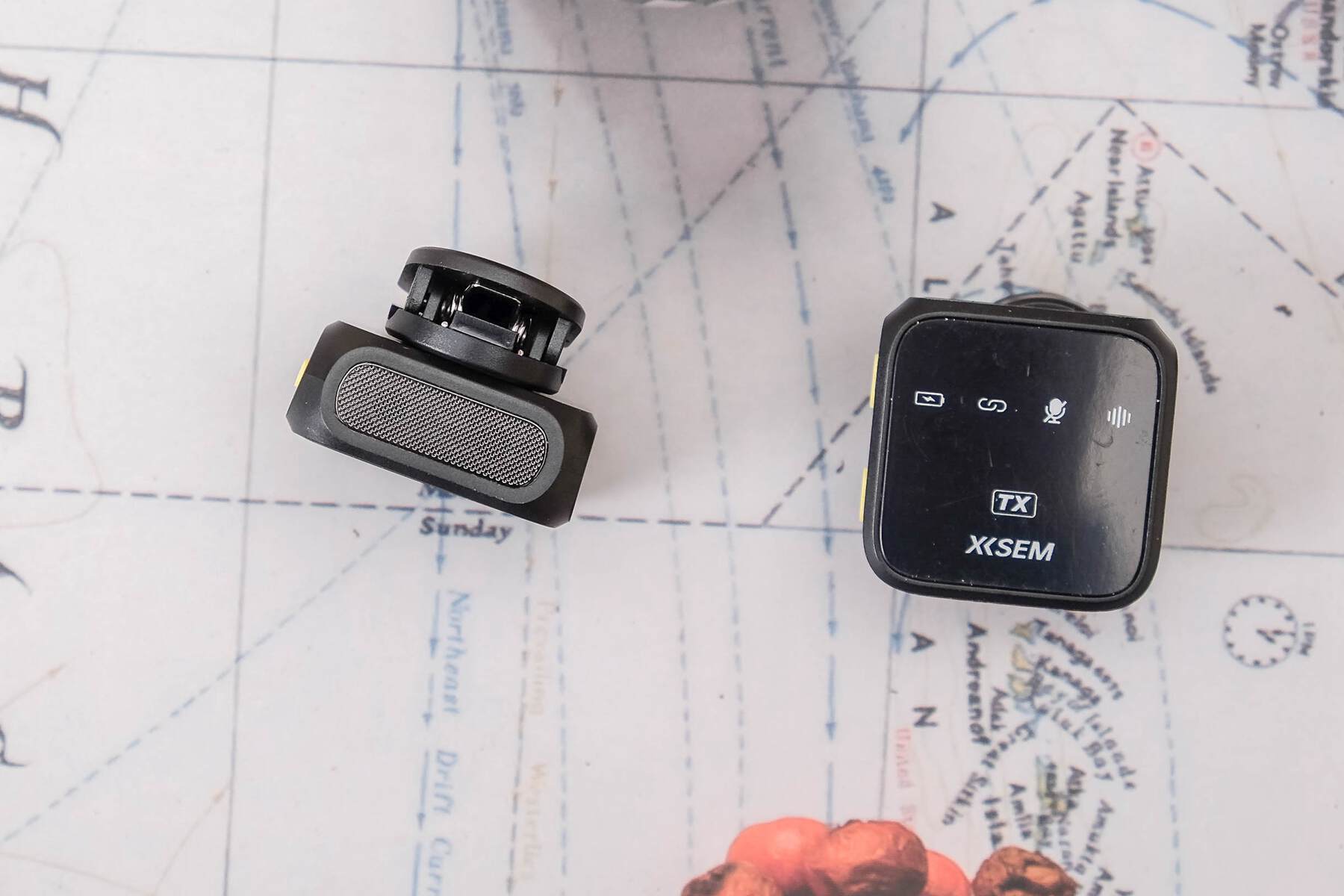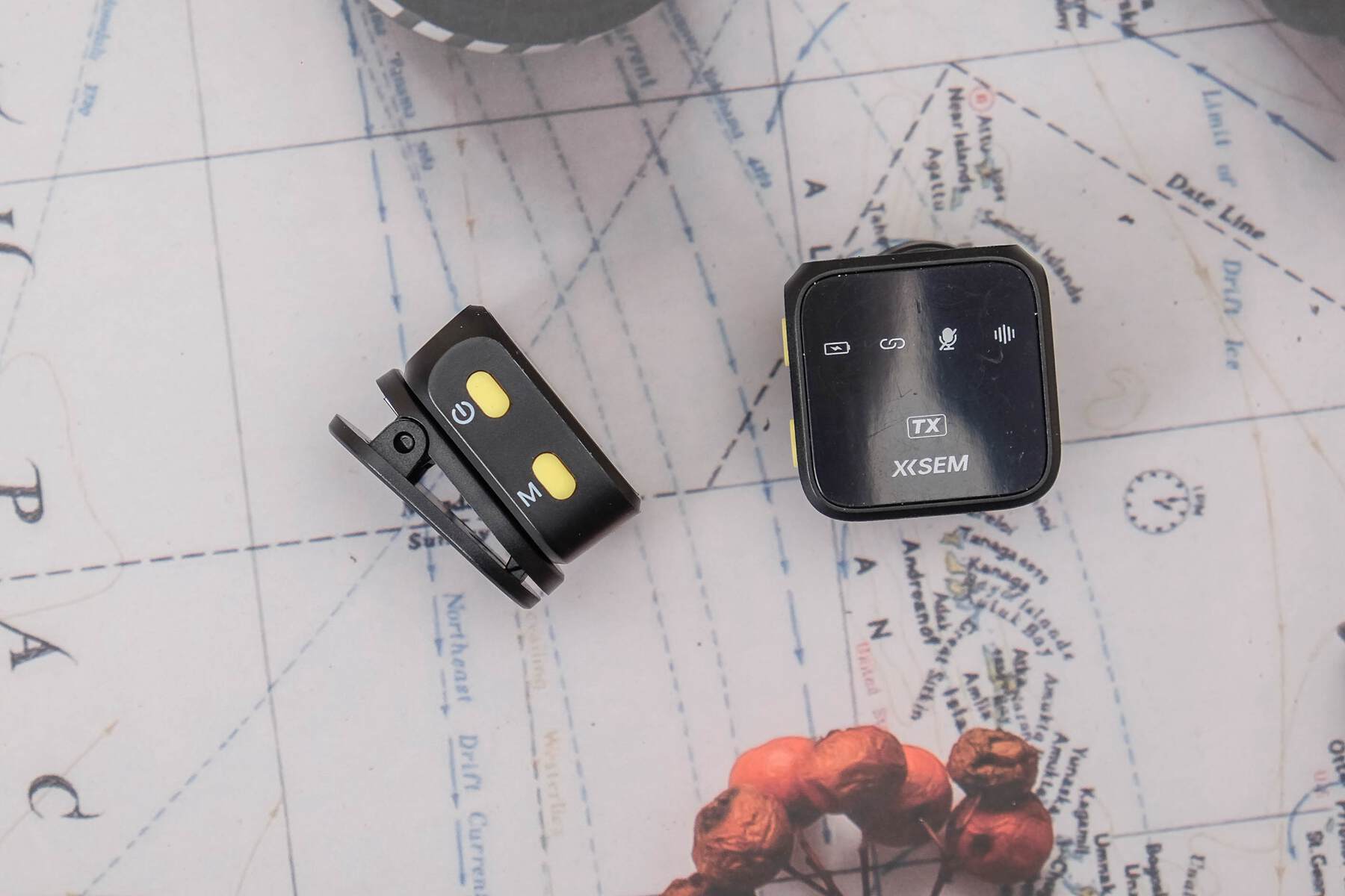 打开充电盒,还是老样子,两个麦克风发射端和一个接收端。不同在于麦克风发射端的重量依旧轻盈,仅有10g重量。除了保留原有的夹子佩戴方式,这次加入了磁吸纽扣设计,佩戴更加自由和方便。