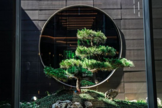 涵碧松青:交流中心的庭院内,种植了造型黑松,呼应南京大学三色之一“青色”,彰显百年名校古朴苍劲的独特气质。
